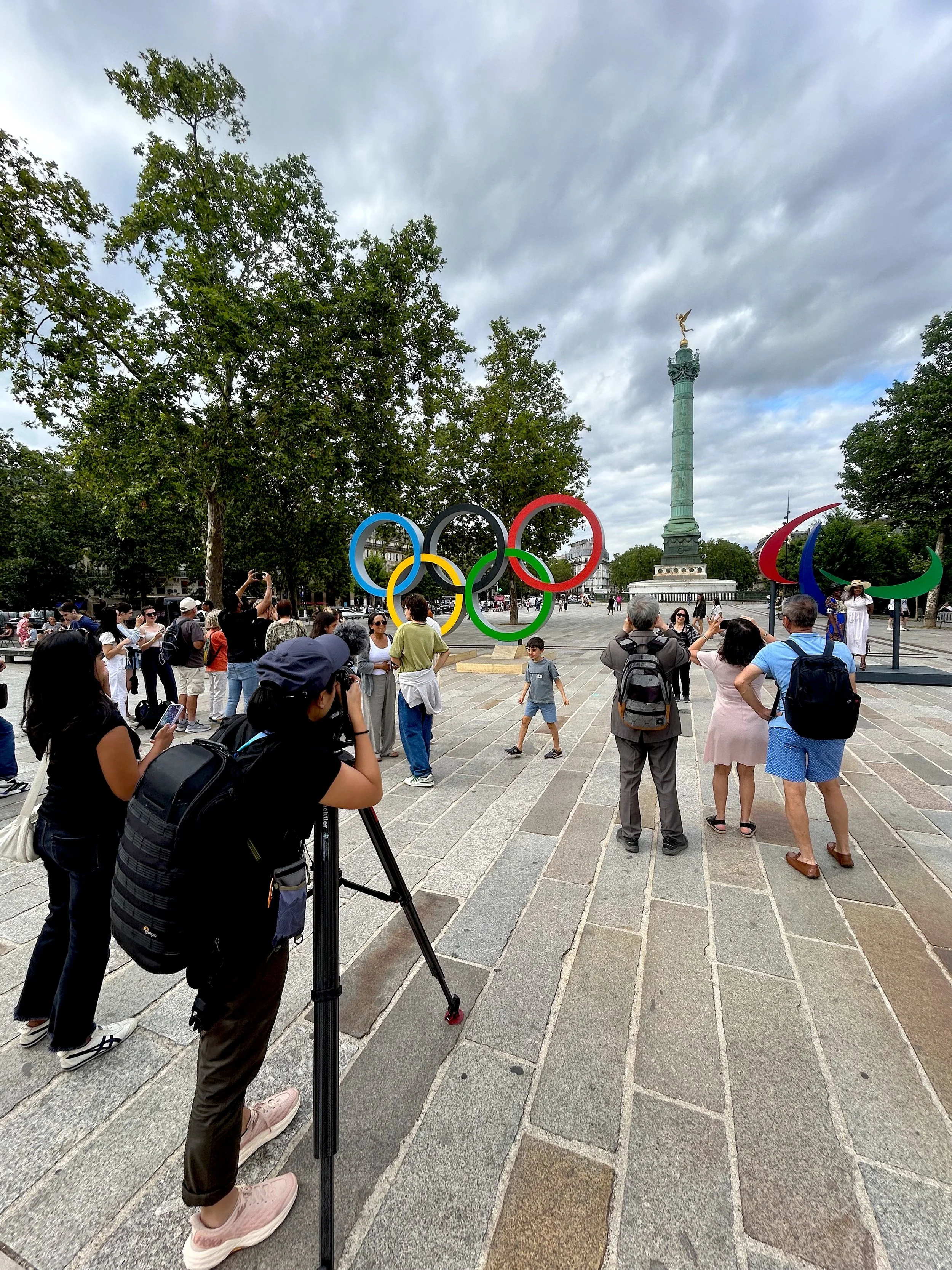 Filming at Place de la Bastille in Paris, with a small crew of CBC News reporter