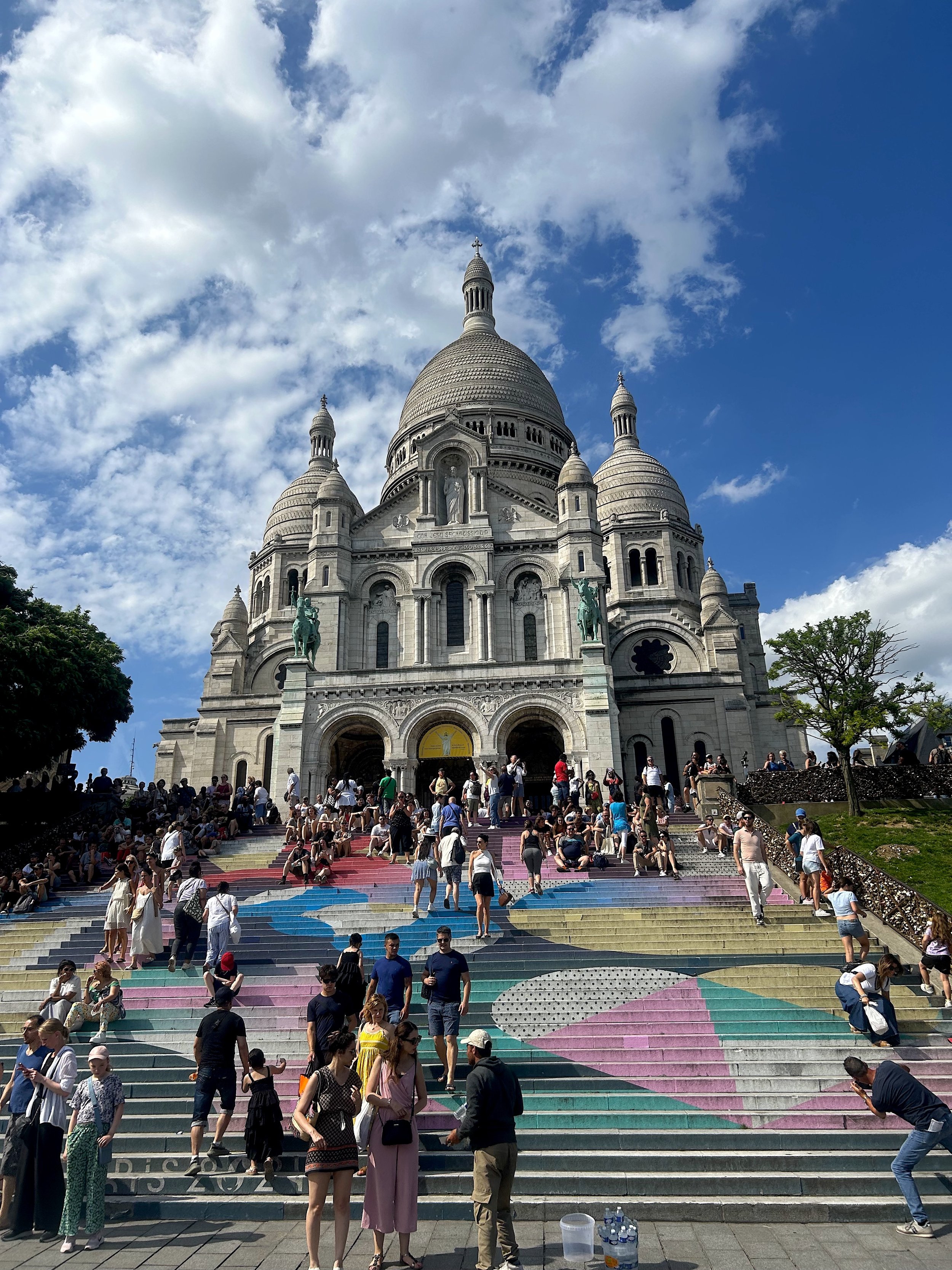 The Sacré-Coeur Basilica in Montmartre, Paris, with the staircase flocked to the colours of the Paris 2024 Olympic Games.